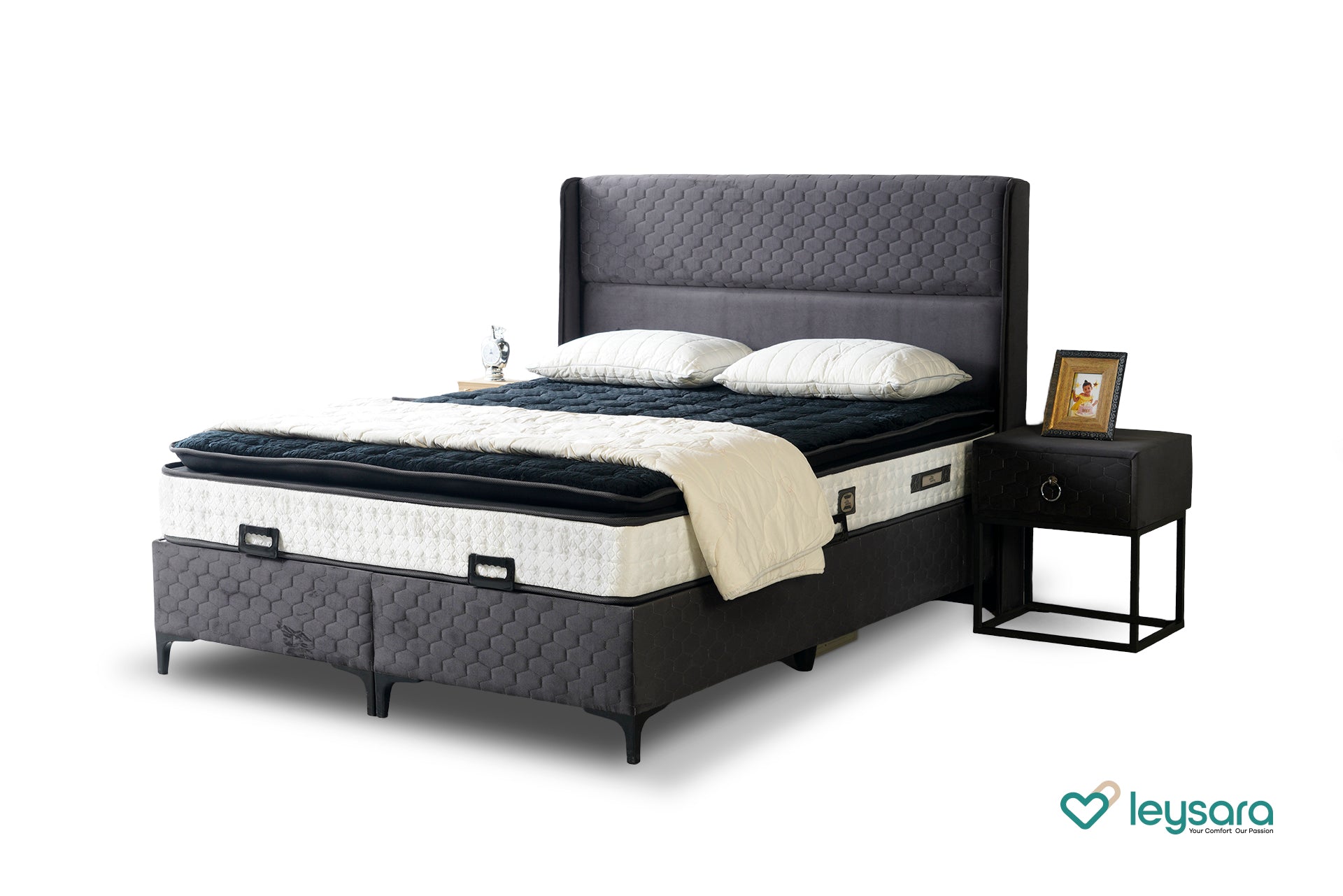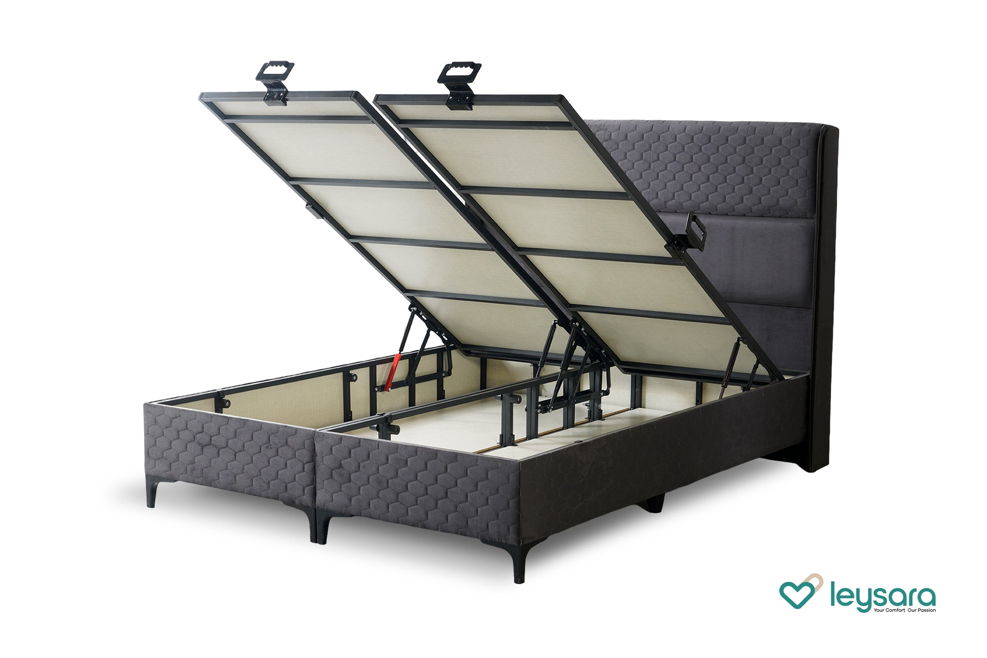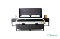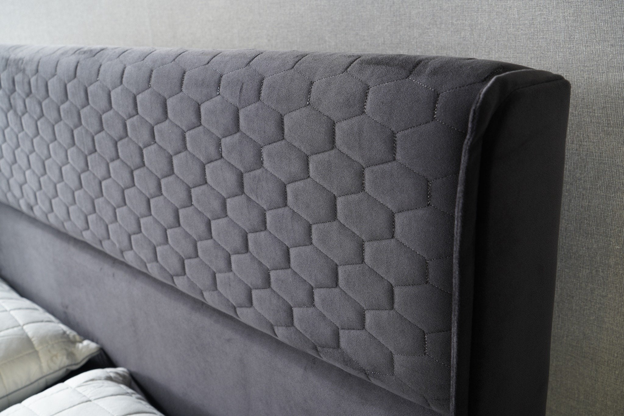 Ontdek de Nero, een luxe king size bed in donkergrijze velvet stof. Elegant design, stevige kwaliteit en heerlijk comfort – compleet geleverd met matras, exclusief bij Leysara.